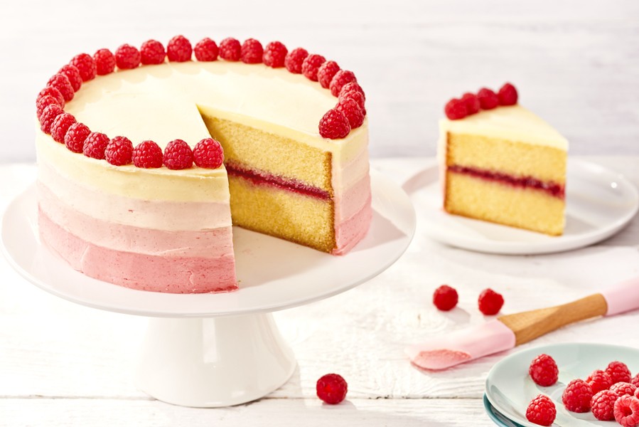 - By kolory ładnie się ze sobą zlały, wygładź wierzch i boki delikatnie szpatułką. Udekoruj gotowy wypiek świeżymi malinami.