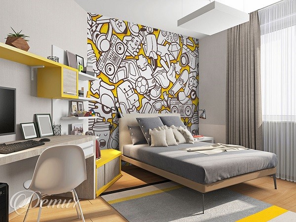 Utrzymana w kolorystyce bieli, żółci i czerni fototapeta świetnie sprawdzi się jako ozdoba pokoju młodzieżowego. Trudno wyobrazić sobie coś, co lepiej odzwierciedli zmienne nastroje młodych dorosłych. Ciekawe, unikalne wzory sprawią, że już od wejścia pokój będzie żywy, radosny i pełen dynamiki.