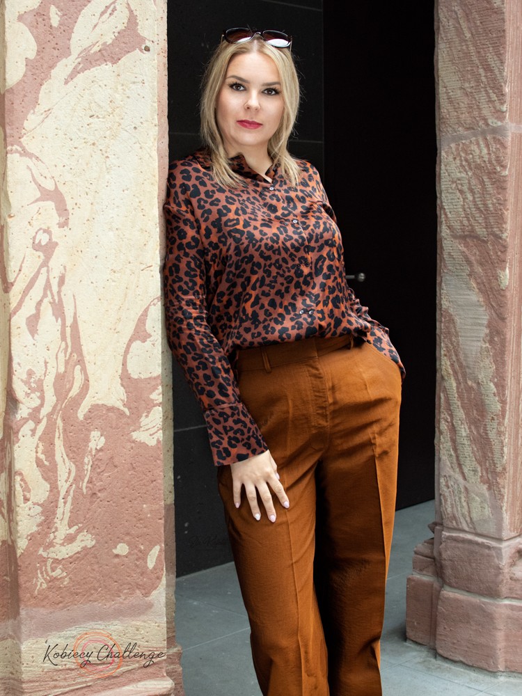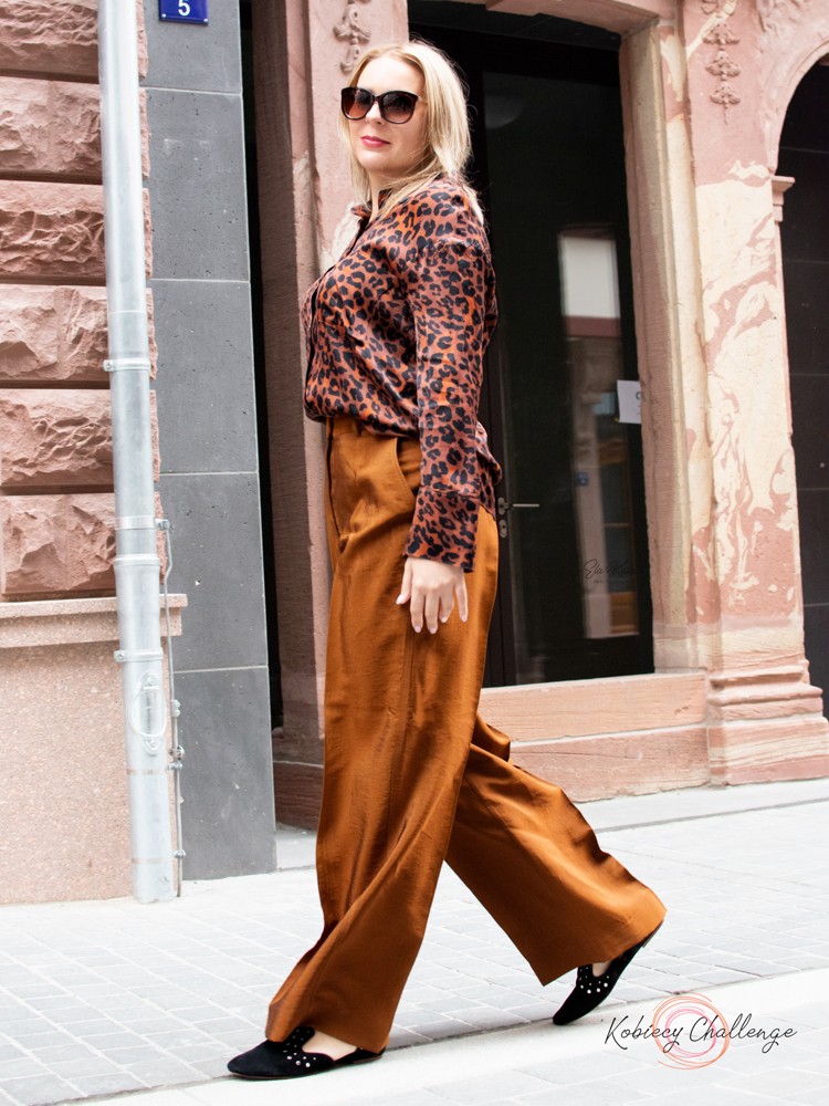 W naszej stylizacji postawiłyśmy na dwurzędową koszulę w modnym wzorze w panterkę, która łączy w sobie elegancję i oryginalny look. Koszula oprócz modnego wzoru przyciąga spojrzenia także delikatnie połyskującą tkaniną, z której została uszyta. O ile dress code Waszej firmy pozwala na to, możecie tył koszuli pozostawić wyciągnięty ze spodni.