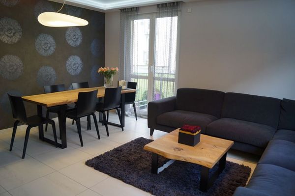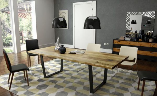 Oczywiście ta młodzieżowa aranżacja nie będzie pasować do wszystkich mieszkań. W tych, które chcemy utrzymać w nowoczesnym, ale mimo wszystko bardziej stonowanym stylu, poleca się meble i dodatki w kontrastujących barwach. Może to być czarno-brązowa, drewniana komoda i utrzymany w tym samym stylu stół o nieregularnym kształcie, wykonany z litego drewna – o dębowym blacie oraz czarnych, stalowych nogach w kształcie litery V. Nowoczesnym dodatkiem będą krzesła ustawione naprzemiennie – czarne i białe, a także wzorzysty dywan i ściana pomalowana na jeden z dominujących na podłodze kolorów.
