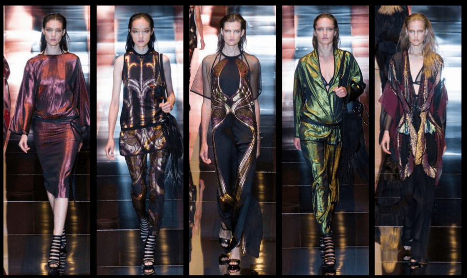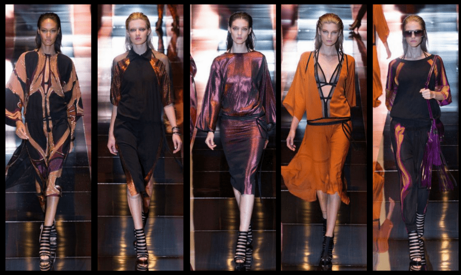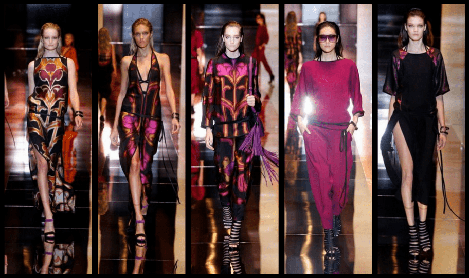 Doszukać się można inspiracji w latach 70tych, lekko spływające tkaniny i gra wzorów. Niektóre projekty przypominają nawet szlafroki. Odsłonięta bielizna, kwiatowe style pomieszane z nowoczesnymi akcesoriami czy frędzle opinające biodra. Projektantka Frida Giannini pokusiła się o bardzo jesienne kolory, w kolekcji dominuje czerń, złoto i bordo.