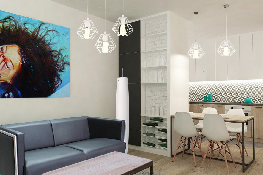 Aby spotęgować efekt jasności pomieszczenia warto zastosować intensywne, wielopunktowe oświetlenie. Z uwagi na ograniczoną przestrzeń bardziej polecam lampy ścienne niż lampy podłogowe, chociaż zwarta i niezbyt duża lampa stojąca nie zrobi wielkiej krzywdy, a wygląda bardzo efektownie. W roli lamp sufitowych najlepiej sprawdzą się bardzo modne ostatnio wiszące lampy ażurowe, które wydają się lekkie optycznie i dają dużo światła.