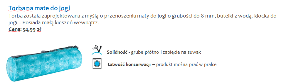 Torba została zaprojektowana z myślą o przenoszeniu maty do jogi o grubości do 8 mm, butelki z wodą, klocka do jogi… Posiada małą kieszeń wewnątrz.