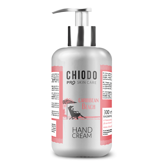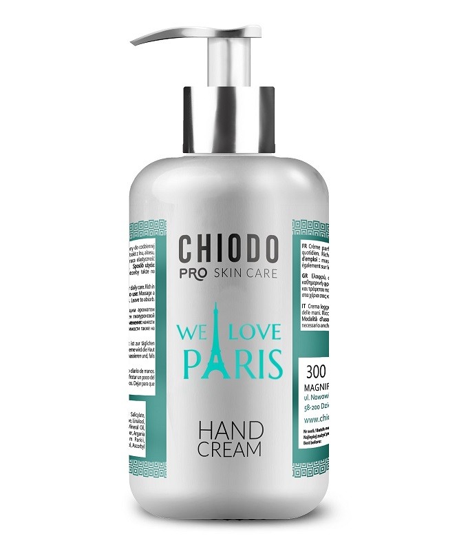Lekki perfumowany krem ChiodoPRO przeznaczony jest do codziennej pielęgnacji dłoni i paznokci. Produkt bogaty jest w hialuronian sodu, masło shea, mocznik, pantenol, olej z ogórecznika, kolagen oraz elastynę.