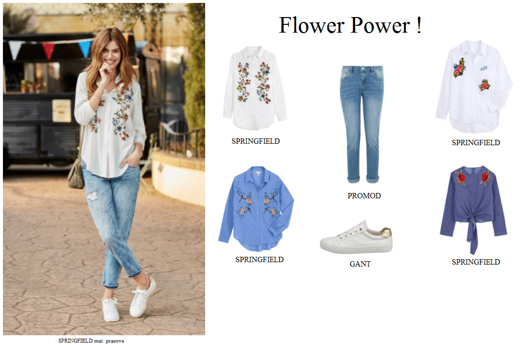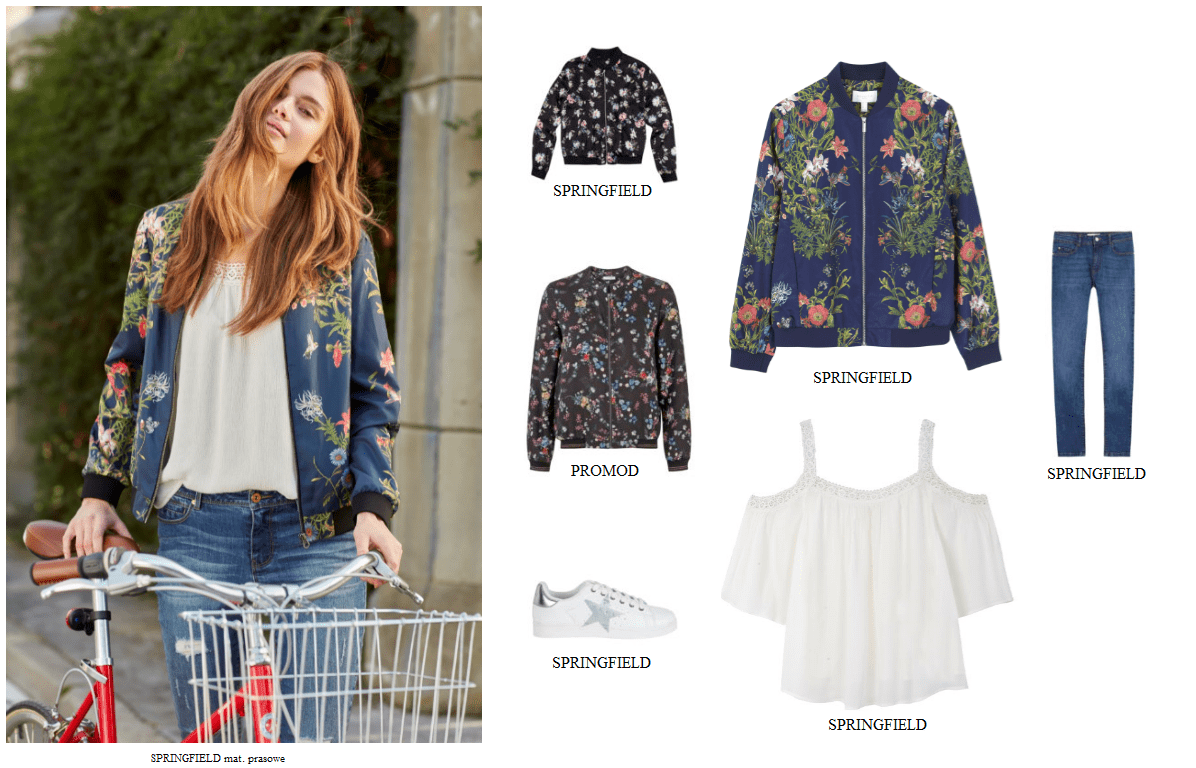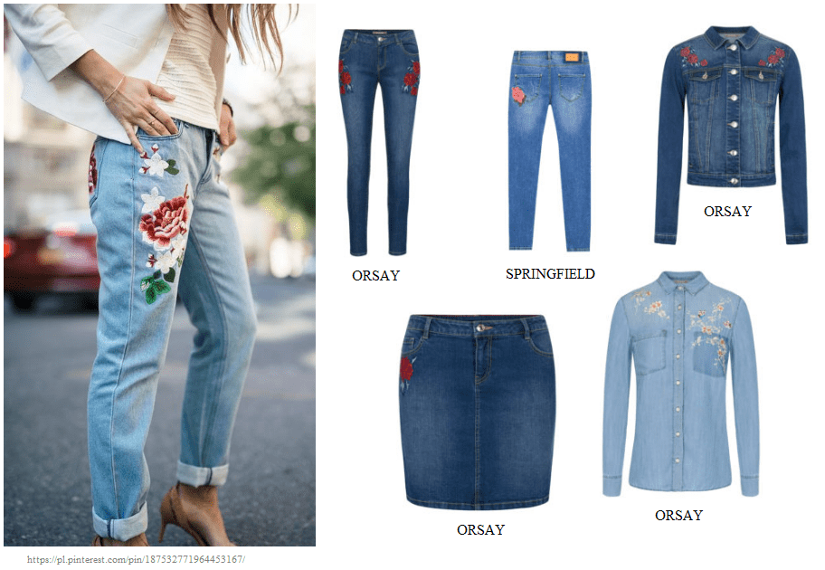 z jeansową kurtką. A jeśli mowa o jeansie, motyw kwiatowy pojawia się także na spodniach i spódnicach. Warto wtedy postawić na prosty biały t-shirt jako dodatek.