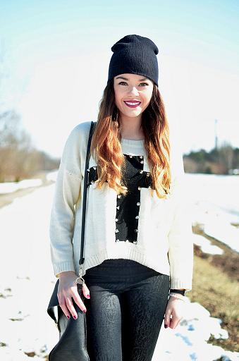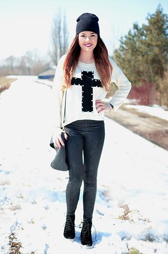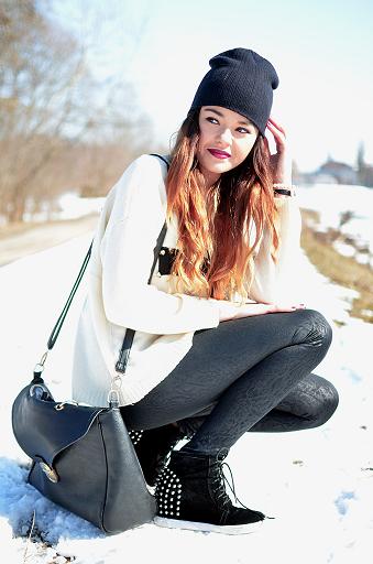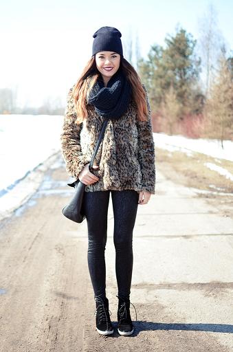 Nowa stylizacja Za dwa dni kalendarzowa wiosna, jednak za oknem nic nie wskazuje na to aby zjawiła się u nas punktualnie. Na dworze nadal mamy minusowe temperatury oraz śnieg. Czasami jednak wyjdzie do nas słońce, które jest prawdziwym ukojeniem tych dni. Jednak nie ma co się niepotrzebnie niepokoić tylko korzystać z ostatnich śniegowych dni. Warto pokombinować z zimowymi stylizacjami. Jak widzicie, dość eleganckie futerko zestawiłam z mniej zobowiązującymi rzeczami tak, że powstał fajny casualowy look 🙂 Swetry w połączeniu z takim typem legginsów jakie prezentuję w poniższej stylizacji są absolutnie moim faworytem jeśli chodzi o zimowe zestawy.