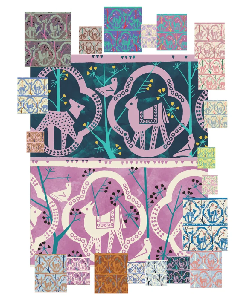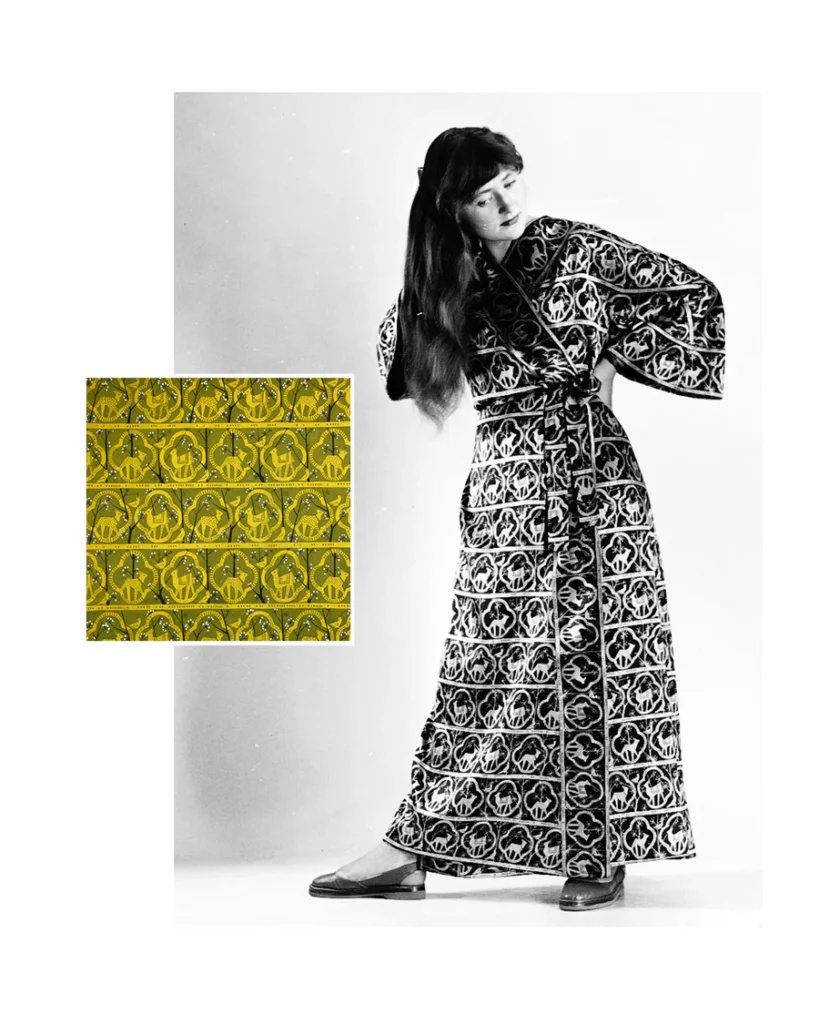 Na początek wzięłyśmy na warsztat wzór stworzony w 1955 r. przez Danutę Paprowicz-Michno, jedną z czołowych projektantek Zakładu Tkanin Instytutu Wzornictwa Przemysłowego. Według opowieści artystki, inspiracją do stworzenia wzoru była wizyta w ogrodzie zoologicznym, gdzie mogła z bliska podziwiać dzikie zwierzęta – w tym rysie, które stały się głównym motywem projektu. Są tu też elementy orientalne i nawiązanie do ludowości, a całość jest charakterystyczna dla nowego stylu lat 50. XX w. W latach 20. XXI wieku znalazłyśmy ten print w archiwach IWP i z artystą Marcinem Franczakiem odtworzyłyśmy na bazie małego skrawka materiału, w nowych, rozświetlających kolorach – idealnych na wiele kolejnych wiosen.