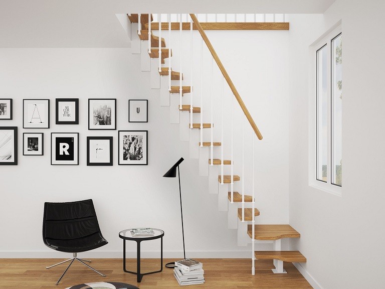 Fot. Rintal Polska.  Schody Mini Plus ze stopniami z litego dębu w kolorze natura, balustradą Tube 25 malowaną na biało oraz pochwytem w kolorze stopni (cena od 11 tys. w ramach promocji „Październik bez VAT”)