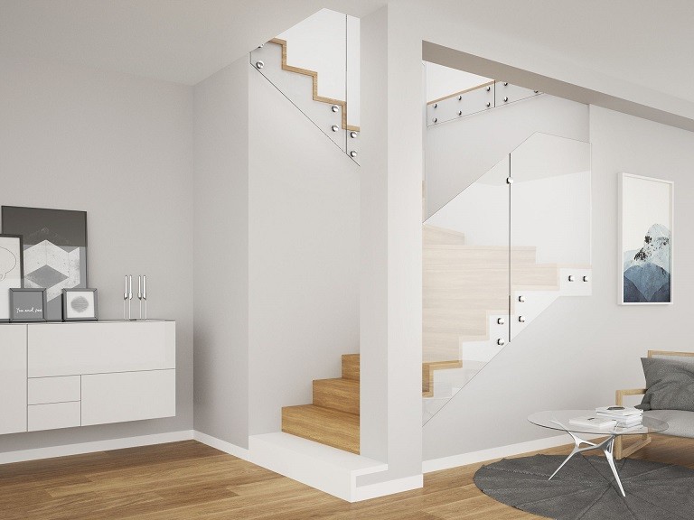 Równie trendy we wnętrzu skandynawskim jest szkło, które nadaje przestronności, nie zaburzając minimalistycznego charakteru aranżacji. Świetnie wyglądać będzie szklana balustrada o tafli wpuszczonej w stopień lub/i wykończona nakładanym od góry pochwytem wykonanym z tego samo gatunku i w tym samym kolorze drewna, co stopień.