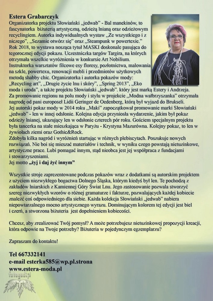 „Bal Manekinów” to kolejna odsłona projektu Estery i Andrzeja Grabarczyk o jakże wymownej nazwie „Słowiański Jedwab”. Idea tego artystycznego melanżu mody, muzyki i teatru zrodziła się kilka lat temu podczas poszukiwania przez Esterę formy wyrazu dla pomysłów, które rodziły się w jej kolorowej głowie. Estera – fascynująca się recyklingiem i ożywianiem materii w nowej odsłonie, postanowiła pokazać światu swoją pasję poprzez len – materiał będący jednym z zapomnianych skarbów Dolnego Śląska.