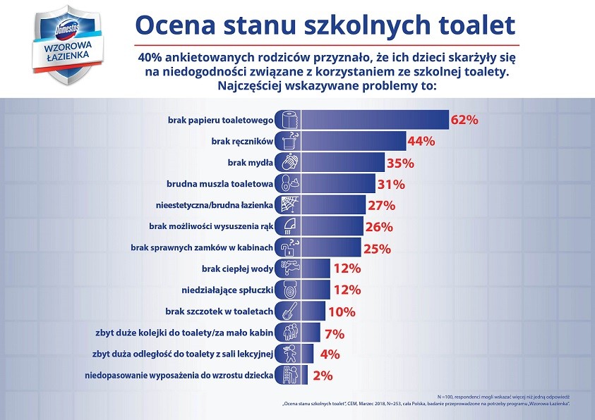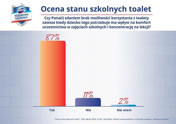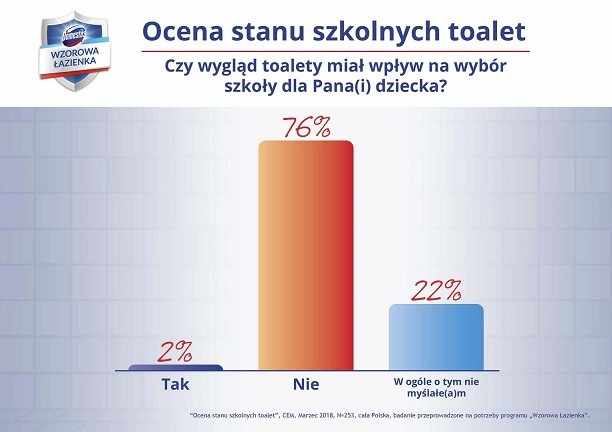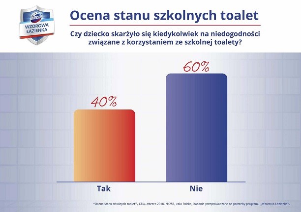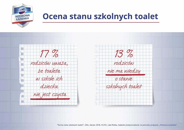 Jak wynika z ogólnopolskiego badania „Ocena stanu szkolnych toalet” przeprowadzonego na potrzeby programu „Wzorowa Łazienka” w marcu 2018 r. wśród rodziców uczniów publicznych szkół podstawowych z klas 1-7, blisko co trzeci ankietowany rodzic posiadający dziecko w szkole podstawowej uważa, że toaleta w szkole jego dziecka nie jest czysta lub nie ma wiedzy na temat jej stanu. Jednocześnie aż 40% ankietowanych rodziców przyznało, że ich dzieci skarżyły się na niedogodności związane z korzystaniem ze szkolnej toalety.