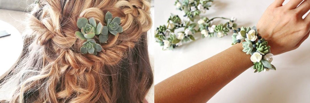 Można dodać do nich inne kolorowe kwiaty jak róże, eustomę, dalie, peonie, amarylis, hortensje czy frezje. Przepięknie wyglądają, gdy połączone są z kolorowymi kwiatami, różnego gatunku. Jednak w stonowanych kolorach jak beżowy, soczysta zieleń czy miętowy prezentuje się zjawiskowo. Do stylizacji Panny Młodej oprócz bukietu ślubnego, można przygotować bransoletkę z sukulentów, czy ozdobić nimi włosy.