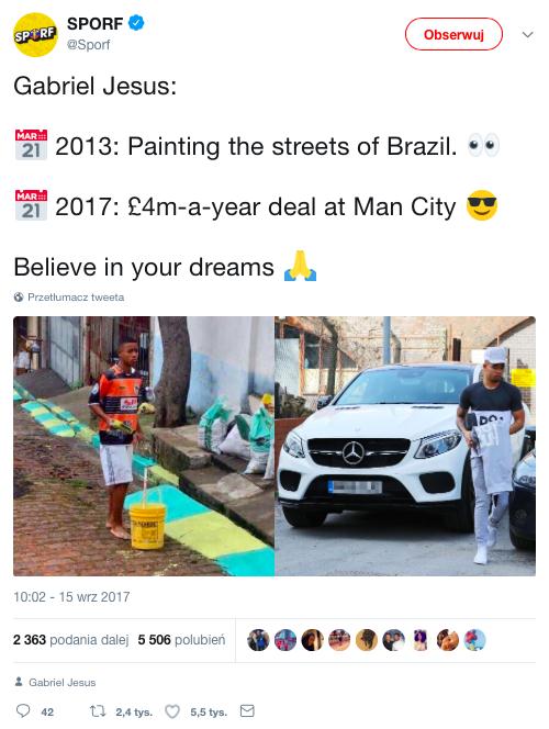 Tego typu historii jest znacznie więcej. Wielu sportowców mogło jednak śledzić poczynania swoich idoli tylko w telewizji. Nowa gwiazda brazylijskiej piłki, czyli Gabriel Jesus, podczas mundialu w 2014 roku w jego rodzinnym kraju malował ulice. Przez kolejne cztery lata zrobił ogromny postęp piłkarski. Przeniósł się do Manchesteru City, gdzie pod wodzą Pepa Guardioli rozwinął się niesamowicie. Jest jedną z gwiazd obecnej kadry Brazylii. W drużynie Canarinhos tworzy tercet ofensywny z Philippe Coutinho i Naymarem. Jest jedną z największych nadziei współczesnego futbolu. Możemy go nazwać symbolem walki o marzenia. Stwierdzenie „dopóki wierzysz, jesteś zwycięzcą” jest w tym przypadku w pełni uzasadnione.